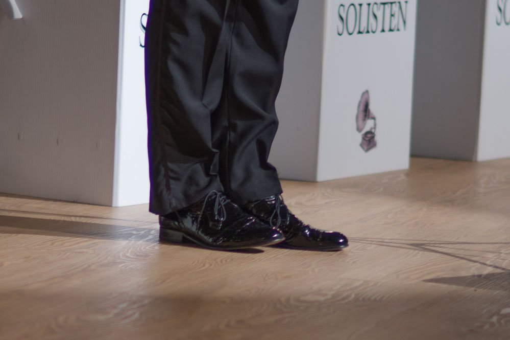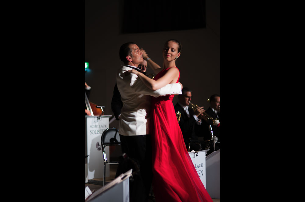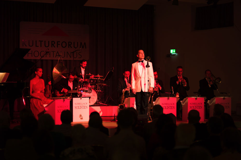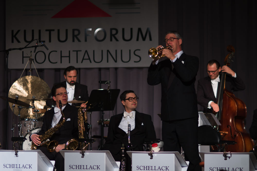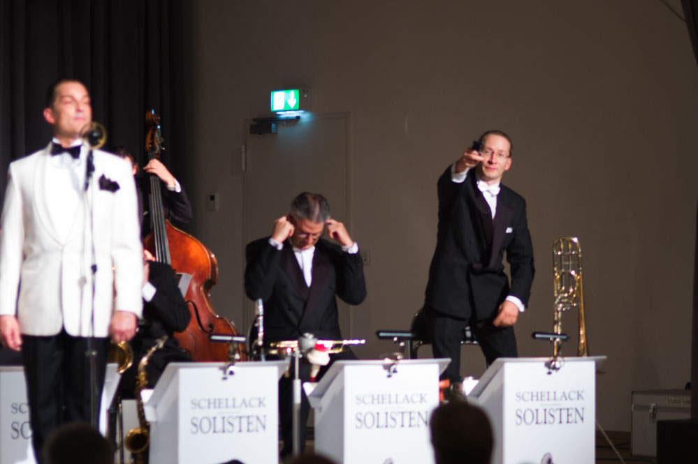 Doch zurück zum Anfang. Mit „Weißt Du, was Du kannst“ von Austin Egen (1897-1941) ging es im Stil der Comedian Harmonists los. Und im selben Stil wechselten die Schellack-Solisten zu „Skandal im Sperrbezirk“ der Spider Murphy Gang aus dem Jahr 1981. Frontmann Denis Wittberg übernahm nicht nur den Gesang, er hatte auch die schwere Aufgabe, das gesamte Konzert lang den unnahbaren Gentleman zu spielen, wie man sich ihn aus der Schellack-Zeit vorstellt: Stocksteif und mit fast ausdruckslosem Gesicht, das sich nur hin und wieder dazu hinreißen ließ, eine Augenbraue hoch zu ziehen. Dem Orchester war die Begeisterung am Spiel und den netten Zwischeneinlagen anzumerken. So war der Posaunist auch der Mann mit dem Revolver in einem Titel von 1930, in dem es um einen Geräuschemacher beim Film ging.