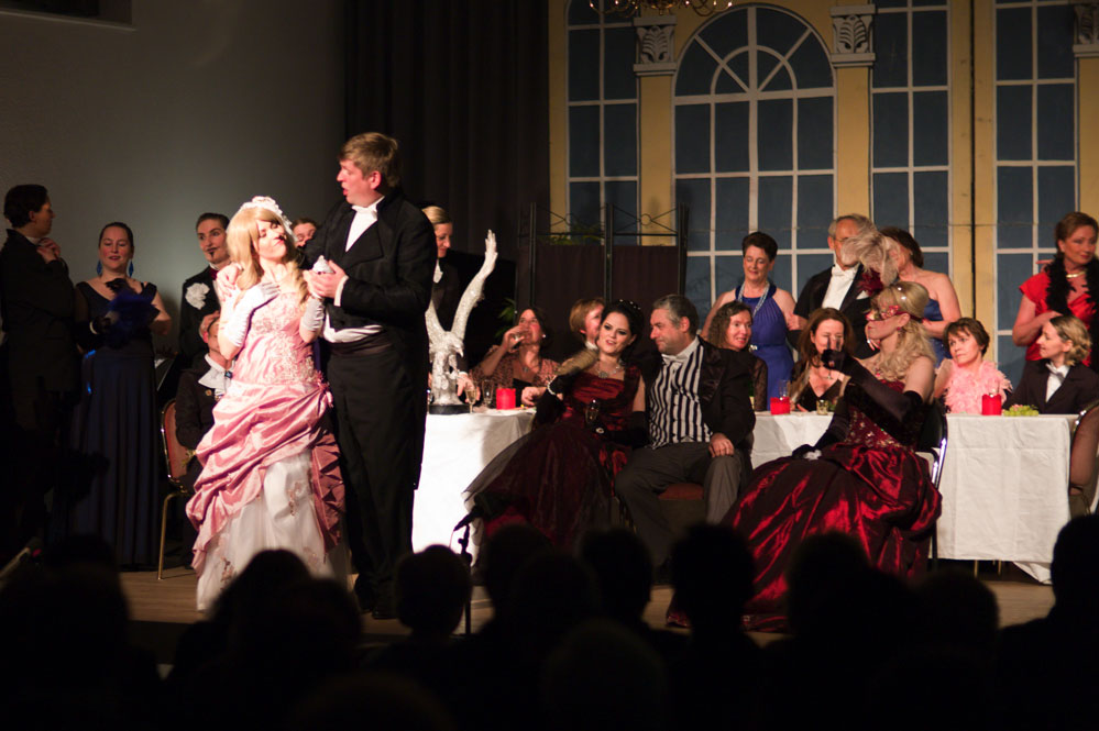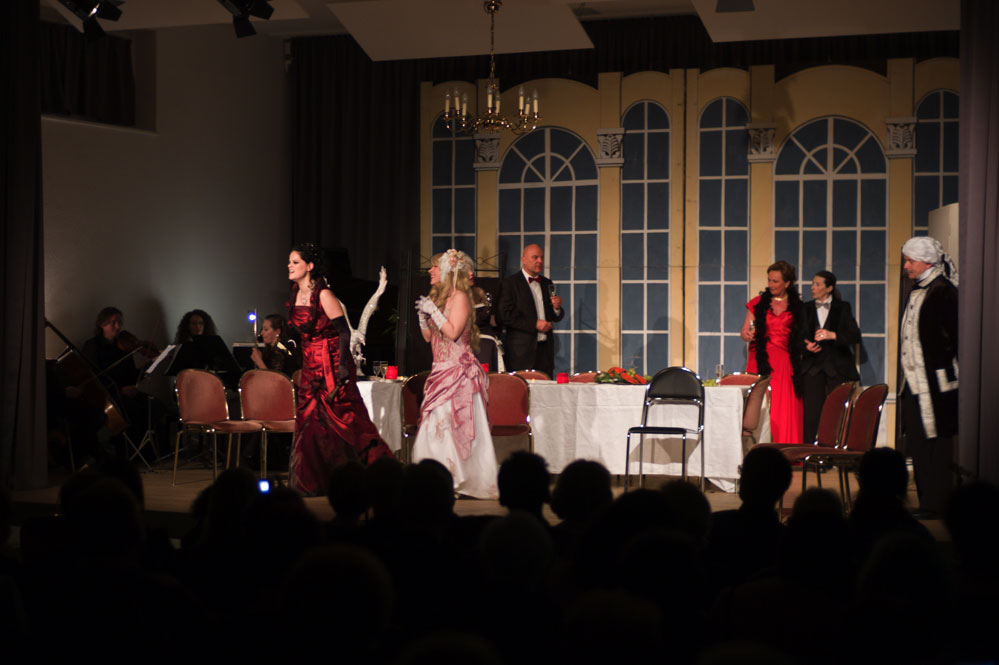 Das Salonorchester hatte Anna Tyshayeva (Flügel) aus internationalen Instrumentalisten zusammengestellt. Ferdinand Pastorek (Geige), Michael Belsky (Cello) und Olga Schaflinskaja (Flöte) ersetzten unter ihrer Leitung ein großes Orchester, was für die Größe des Kulturforums in Hasselbach durchaus ausreichte. Zum ersten Mal hatte Lucie Schneider die Regie übernommen und eine fröhlich-freche, dem Stoff und Strauß’ Musik angemessene Inszenierung daraus gemacht.